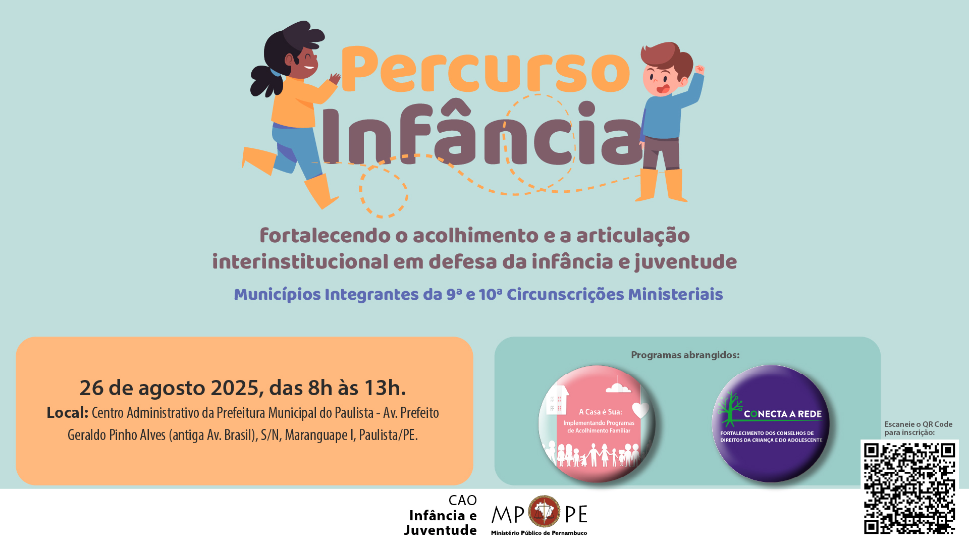 07/08/2025 - A fim de promover e qualificar a discussão interinstitucional sobre a temática do acolhimento de crianças e adolescentes e Conselhos de Direitos, visando o fortalecimento das políticas públicas de infância e juventude, o Ministério Público de Pernambuco (MPPE), por meio do Centro de Apoio Operacional de Defesa da Infância e Juventude (CAO IJ), promove no próximo dia 26 de agosto, das 8h às 13h, a iniciativa “Percurso Infância”.
